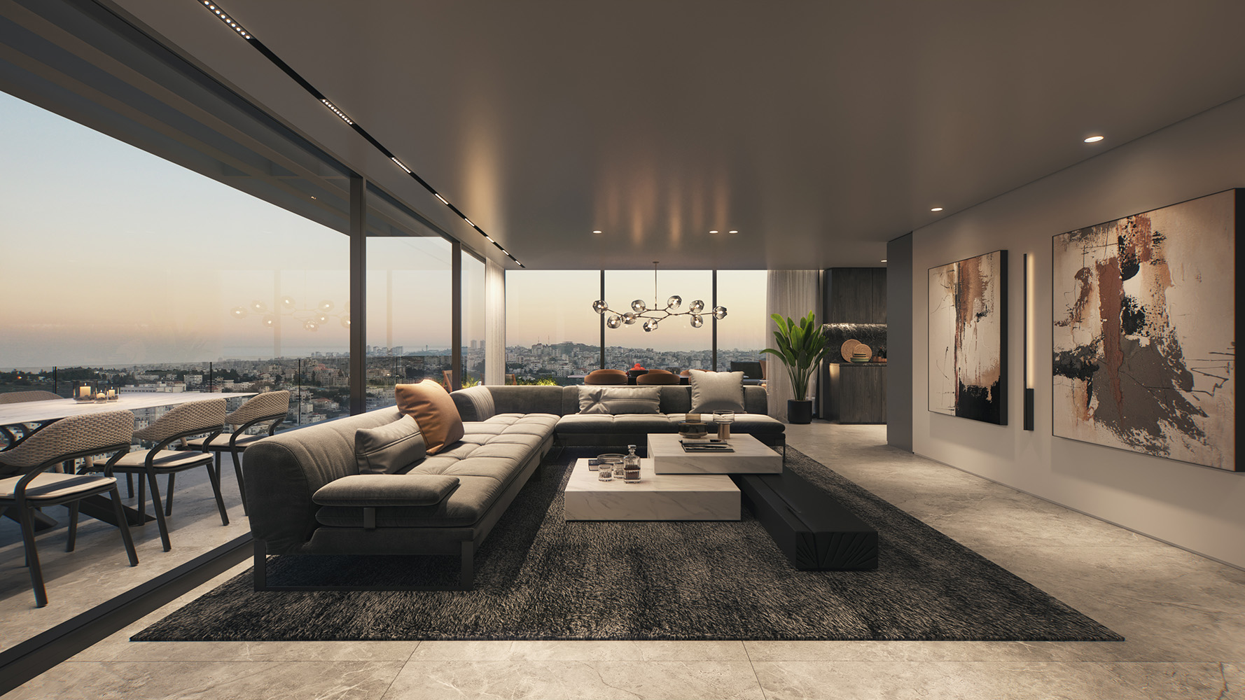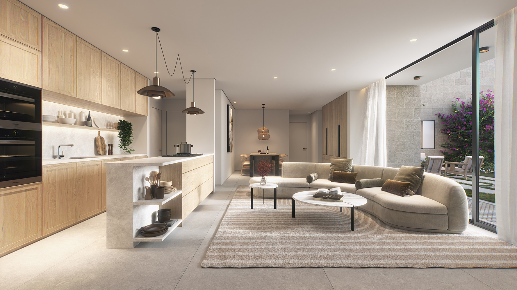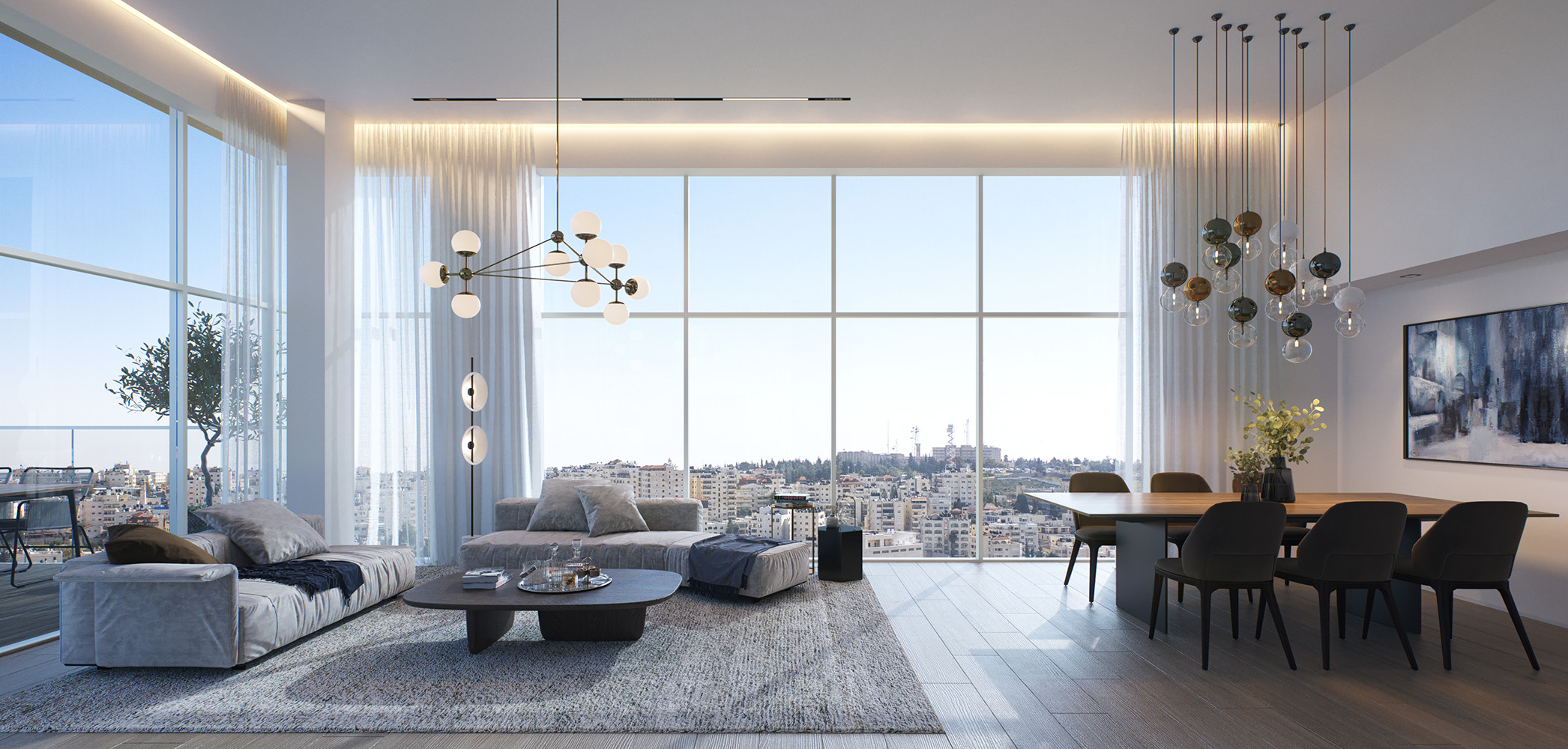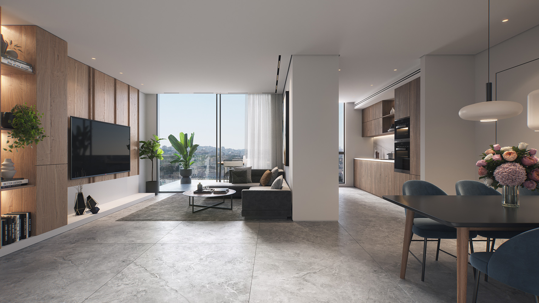 أما التصميم الداخلي، فيجمع بين الحداثة والراحة، ويشمل مطبخاً مجهزاً، ومساحة مخصصة للخدمات، بالإضافة إلى أنظمة تدفئة تحت البلاط وتبريد مركزي (VRF) لضمان تجربة سكنية متكاملة، وتضم البنايات مدخل لوبياً فاخراً، وطوابق مسقوفة لمواقف السيارات وغرف التخزين، بالإضافة إلى حديقة عامة ومحلات تجارية.