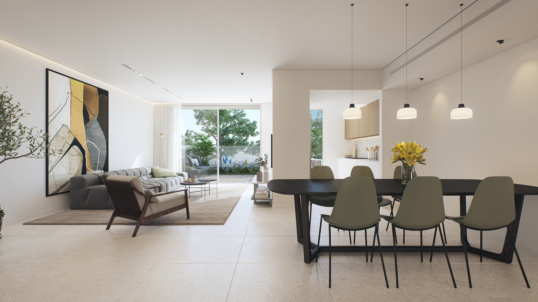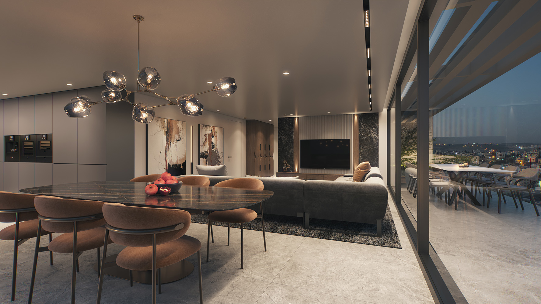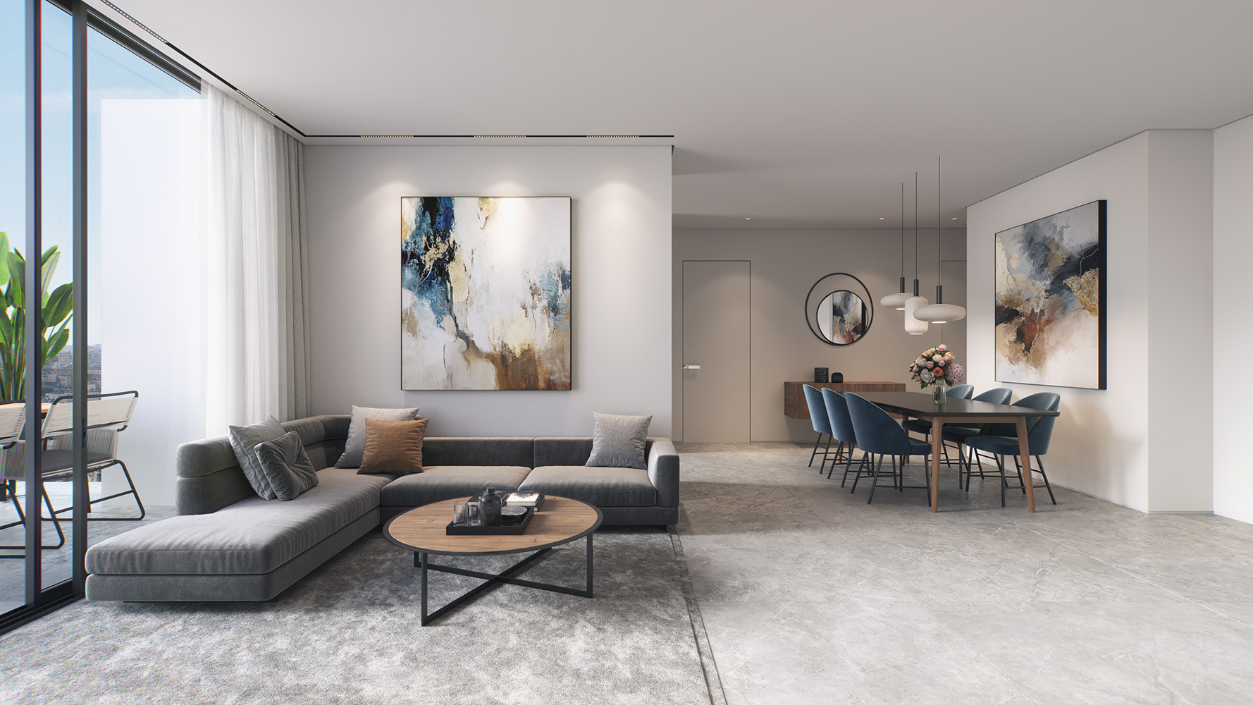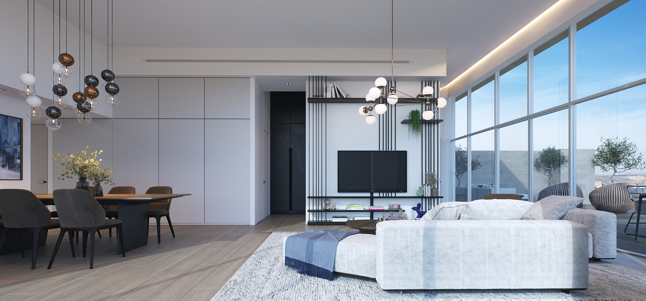 أما التصميم الداخلي، فيجمع بين الحداثة والراحة، ويشمل مطبخاً مجهزاً، ومساحة مخصصة للخدمات، بالإضافة إلى أنظمة تدفئة تحت البلاط وتبريد مركزي (VRF) لضمان تجربة سكنية متكاملة، وتضم البنايات مدخل لوبياً فاخراً، وطوابق مسقوفة لمواقف السيارات وغرف التخزين، بالإضافة إلى حديقة عامة ومحلات تجارية.