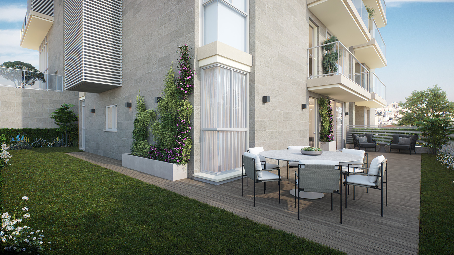 تشمل البنايات مجموعة من الشقق المصممة بذوق رفيع ووفقاً لقانون البيع، لتناسب مختلف الاحتياجات وتلبي كافة الأذواق، وتتنّوع هذه الشقق من شقق بغرفة نوم واحدة حتى شقق بأربع غرف نوم، وتتمّيز بتفاصيلها المدروسة بعناية ومساحاتها المتعددة، حيث تجمع بين الإطلالات الجميلة والشرفات الواسعة، وتتنوع ما بين شقق بحدائق خاصة وأخرى بشرفات ذات إطلالة.